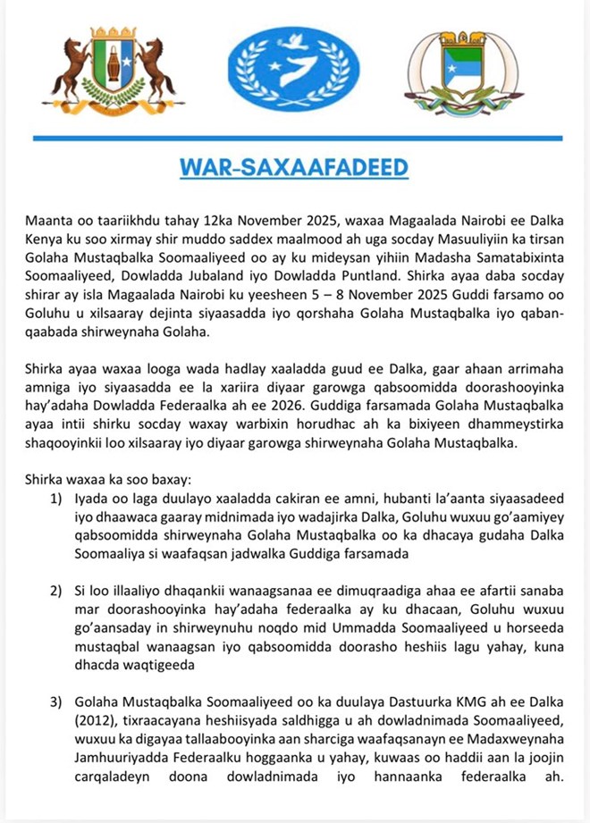 Arbaco, November 12, 2025 (HOL) - Golaha Mustaqbalka Soomaaliyeed oo maanta kulan ku yeeshay magaalada Nayroobi ee dalka Kenya, ayaa uga digay madaxtooyada Soomaaliya tallaabooyinka aan waafaqsanayn Dastuurka Kumeelgaarka ah ee dalka, isla markaana khatar ku ah jiritaanka dowladnimada iyo nidaamka federaalka ee Soomaaliya.