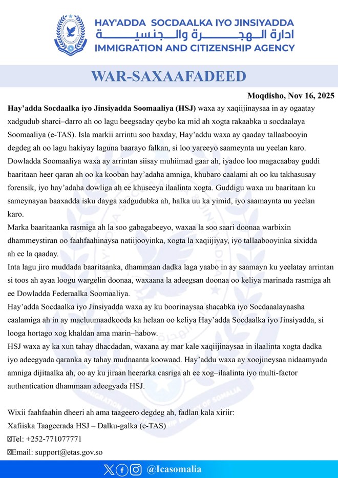 Axad, November 16, 2025 (HOL) - Hay’adda Socdaalka iyo Jinsiyadda Soomaaliya ayaa si rasmi ah xaqiijisay in la jabsaday xogta qaar ka mid ah rakaabka isticmaalay Barnaamijka E-TAS oo ay dhawaan soo kordhisay Hay’adda Socdaalka iyo Jinsiyadda Soomaaliya.