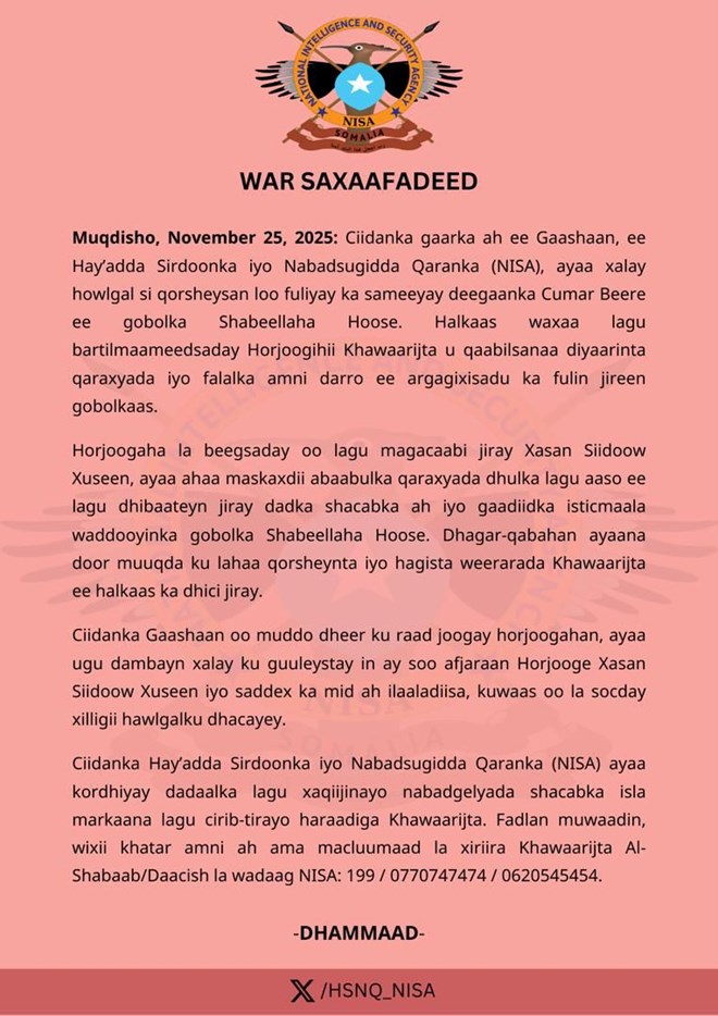 Talaado, November 25, 2025 (HOL) - Ciidanka gaarka ah ee Gaashaan, ee hoostaga Hay’adda Sirdoonka iyo Nabadsugidda Qaranka (NISA), ayaa xalay fuliyay howlgal qorsheysan oo ka dhacay deegaanka Cumar Beere ee gobolka Shabeellaha Hoose.