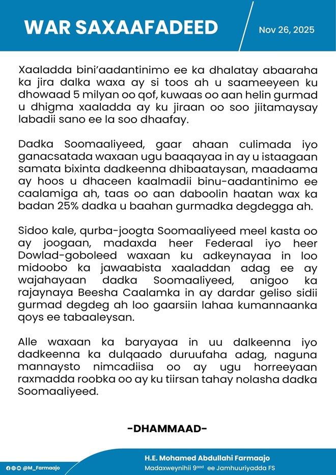 Khamiis, November 27, 2025 (HOL) - Madaxweynihii hore ee Soomaaliya, Maxamed Cabdullaahi Farmaajo, ayaa soo saaray war-saxaafadeed uu uga hadlayo xaaladda bini’aadantinimo ee ka dhalatay abaarta dalka ka jirta, taas oo hadda saameysay ku dhowaad shan milyan oo qof.