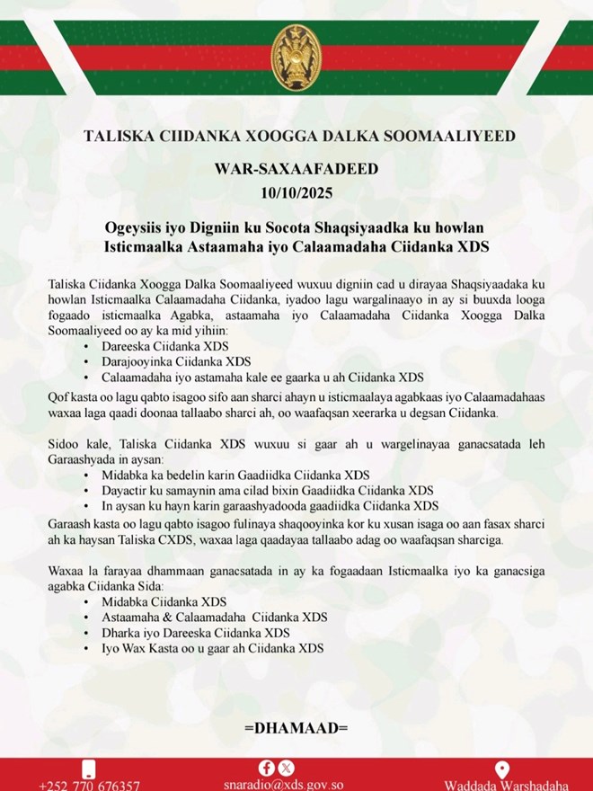 Sabti, October 11, 2025 (HOL) - Taliska ciidanka xoogga dalka Soomaaliya ayaa digniin adag kasoo saaray in la isticmaalo Calaamadaha, Gaadiidka iyo waxyaabaha u gaarka ah ciidamada qalabka sida si loo xaqiijiyo amniga guud ee dalka.