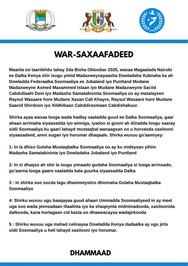 Khamiis, October 2, 2025 (HOL) - Shir ay magaalada Nairobi ku yeesheen madaxweynayaasha Jubbaland, Puntland iyo Madasha Samatabixinta Soomaaliya, ayaa lagu gaaray in si dhaqso ah shir loogu yeero dhammaan qaybaha siyaasadda Soomaaliya si xal qaran looga gaaro caqabadaha jira.