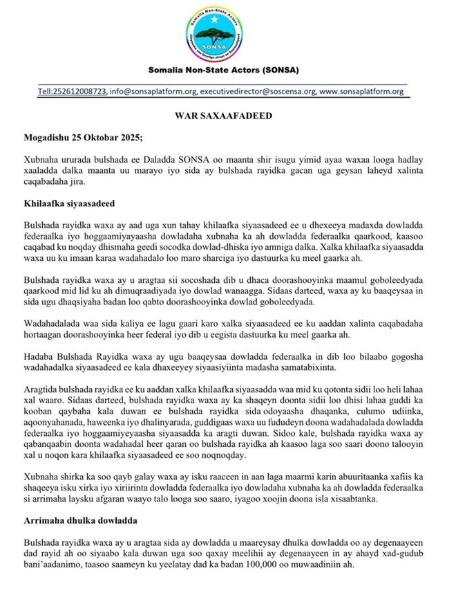 Axad, October 26, 2025 (HOL) - Ururrada bulshada rayidka ah ee Soomaaliyeed ayaa ku baaqay in si degdeg ah loo qabto doorashooyinka Dowlad Goboleedyada oo muddo dheer dib u dhacay, iyagoo uga digay in dib-u-dhac sii socda uu dhaawacayo dimuqraadiyadda iyo hannaanka maamul wanaagga ee dalka.