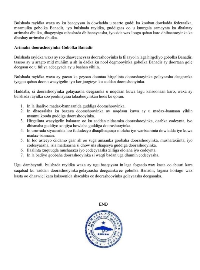 Ururrada bulshada rayidka ah ayaa sidoo kale soo dhaweeyay doorashooyinka dowladaha hoose ee gobolka Banaadir ee lagu wado in la qabto dhammaadka bisha Nofeembar, iyagoo ku tilmaamay tallaabo muhiim ah oo lagu xoojinayo ka-qaybgalka shacabka ee maamulka iyo go’aan qaadashada.