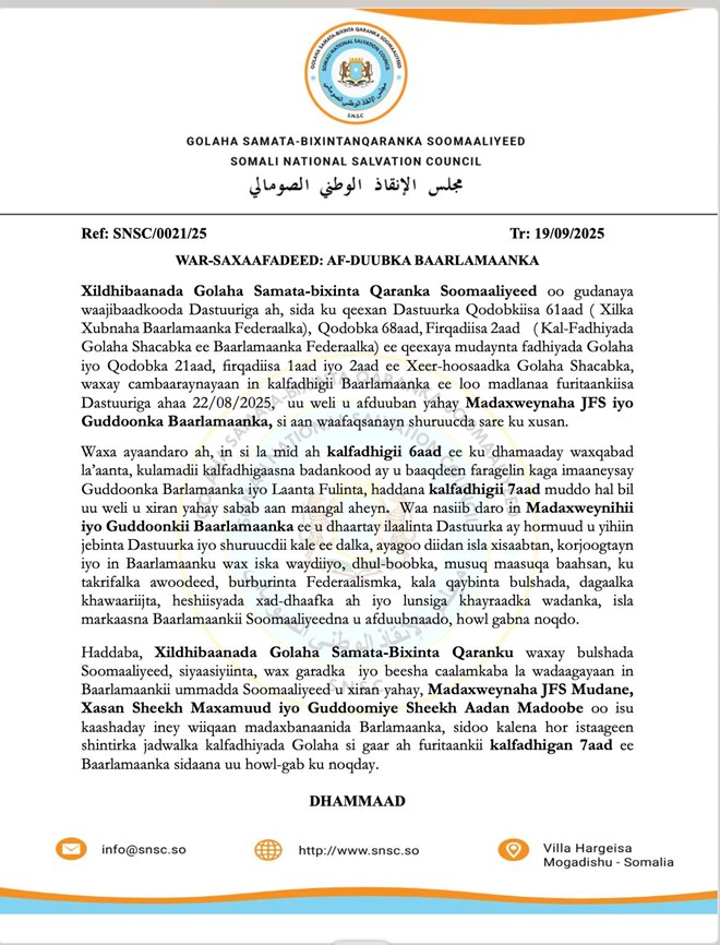 Jimco, September 19, 2025 (HOL) - Xildhibaanada Baarlamaanka Federaalka Soomaaliya ee ku mideysan Madasha Samatabixinta Soomaaliyeed ayaa qoraal ay si wadajir ah u soo saareen eedeymo culus ugu jeediyay madaxweynaha dowladda Fedaraalka Xasan Sheekh Maxamuud iyo guddoomiyaha Golaha Shacabka Sheekh Aadan Maxamed Nuur.