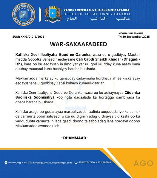 Talaado, September 30, 2025 (HOL) - Xafiiska Xeer Ilaaliyaha Guud ee Qaranka ayaa maanta Maxkamada gobolka Banaadir u gudbiyay dacwada eedeysane Cali Cabdi Sheekh Khadar oo loo yaqaano Dhegadiish,  kaasoo lagu eedeeyay inuu ilmo yar ku riday god, kuna aasay, islamarkaana ka duubay muuqaal uu ku baahiyay baraha bulshada.