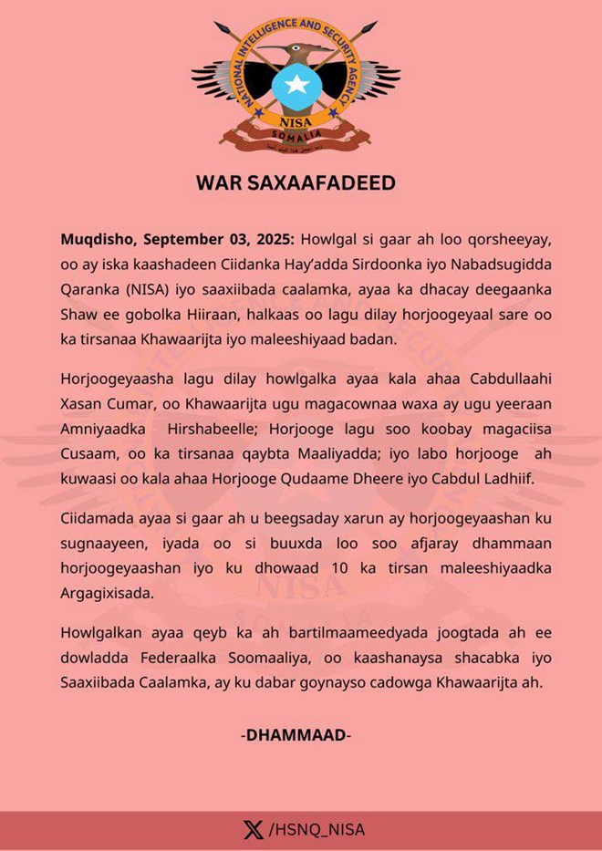 Khamiis, September 4, 2025 (HOL) - Warsaxaafadeed kasoo baxay Taliska Hayádda Nabadsugidda iyo Sirdoonka Qaranka Soomaaliyeed ee NISA ayaa lagu shaaciyay magacyada horjoogayaal ka tirsan Al-shabaab oo lagu dilay howlgal ka dhacay deegaanka Shaw ee gobolka Hiiraan.