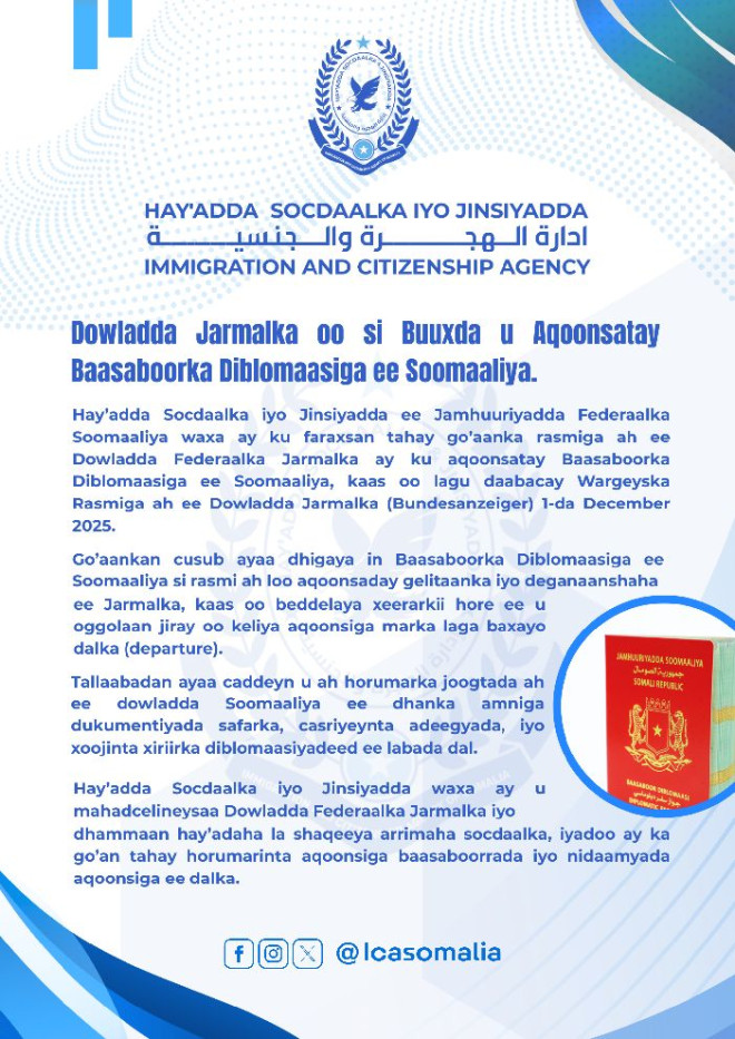 Arbaco, December 3, 2025 (HOL) - Dowladda Federaalka Jarmalka ayaa ku dhawaaqday inay si buuxda u aqoonsatay Baasaboorka Diblomaasiga ee Jamhuuriyadda Federaalka Soomaaliya, arrinta oo si weyn u soo dhaweysay dowladda Soomaaliya.