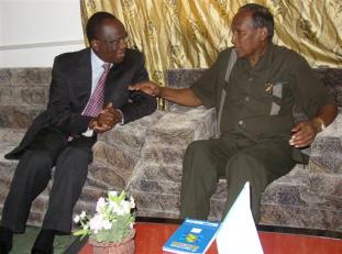 The U.N. Secretary General's special representative to Somalia, Francois Lonseny Fall, left, has discussions with the Somali President Abdullahi Yusuf, Thursday, Jan. 18, 2007 in the capital Mogadishu. A top U.N. envoy said on Thursday that Somalia's government needs protection following its relocation to the capital after ousting an Islamic movement that had held Mogadishu for six months. (AP Photo/Mohamed Sheikh Nor)