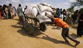 | A Somali boy helped push a donkey cart loaded with food aid that the UN World Food Program distributed yesterday in Yowhar. (ROBERTO SCHMIDT/AFP/Getty Images) |