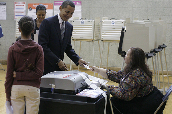 U.S. Democratic presidential nominee Senator Barack Obama casts his vote in the U.S. presidential election at the Beulah Shoesmith Elementary School in Chicago on Tuesday. Photo/REUTERS