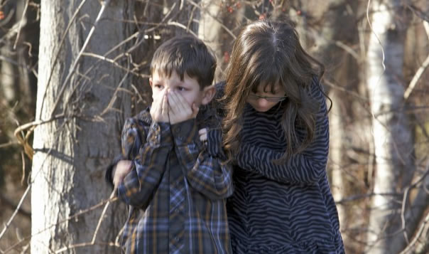 Young children wait outside Sandy Hook Elementary School. (Michelle McLoughlin/Reuters)