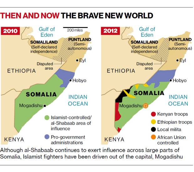 The AU force has increased to 12,000 troops with Uganda and Burundi joined by troops from Kenya and Djibouti, with 5,000 more to deploy. The maps show al-Shabaab under pressure to the west from Ethiopian forces, to the south from Kenya, while Uganda and Burundi are pushing out from Mogadishu, recently taking Afgoye, an important food-producing area 50 miles outside the capital.