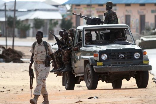 Somali Transitional Federal Government (TFG) soldiers leave on 29 May, 2012 after a clash with Al Qaeda-linked Al Shabaab rebels, who ambushed the convoy of Somali President Sharif Sheikh Ahmed near Elasha. Two Somali soldiers were wounded when Shabaab gunmen opened fire as Ahmed drove down the Afgoye corridor, some 18 miles northwest of the capital Mogadishu, a key road and home to the world's largest concentration of displaced people, for the first time since its capture on May 26. /Mohamed Abdiwahab/AFP/Getty Images/