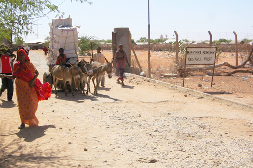 People cross from Somalia into Kenya at the Mandera border control post. Kenya's borders have hundreds of unofficial entry points that police are working to close. [Bosire Boniface/Sabahi]