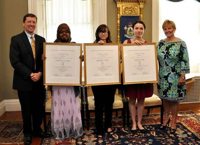 First lady Ann LePage and MCCS President John Fitzsimmons presented the three students with awards and $2,500 checks during a June 19 Blaine House ceremony. The prize money was donated by U.S. Cellular.