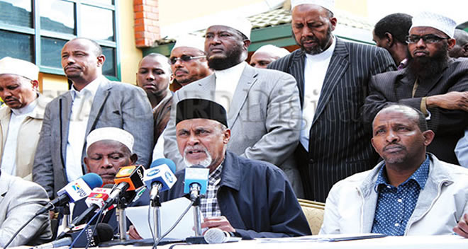 North Eastern Kenya legislators led by Garissa Senator Yusuf Hajji (L) and National Assembly Majority Leader Adan Duale address a press conference on the Degodia and Garee Community conflict at the Red Court Hotel, Nairobi Sunday. [Photo: Ali Alale/Standard]