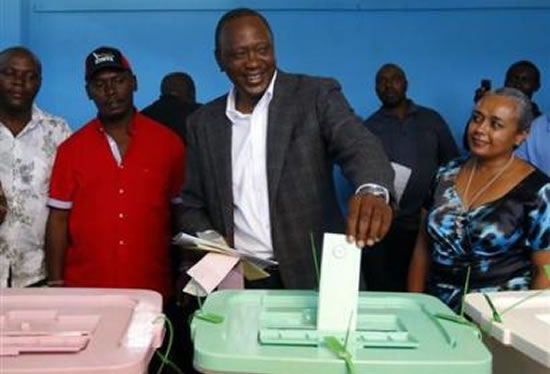 Kenya's Deputy Prime Minister and presidential candidate Uhuru Kenyatta (C) casts his ballot inside a polling station in Kenya's town of Gatundu, March 4, 2013.