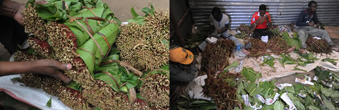 Khat, also called miraa, has been chewed for centuries in the Horn of Africa. Its psychoactive ingredients, cathinone and cathine, are similar to amphetamines but weaker, and can help chewers stay awake and talkative.