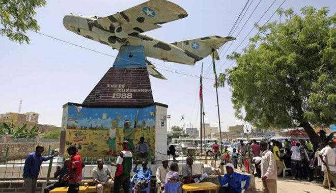 Residents of Somaliland sit under a war memorial of a MiG fighter jet in the centre of town in Hargeisa May 19, 2013.