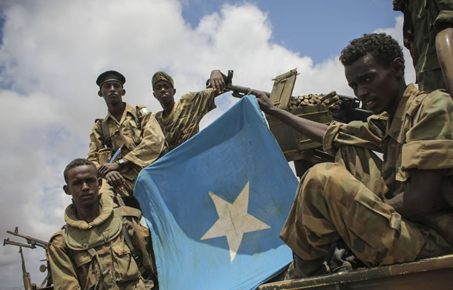 Soldiers of the Kenyan Contingent serving with the African Union Mission in Somalia (AMISOM) display the Somali national flag in Saa’moja October 1, 2012 (African Union-United Nations Handout photo via Reuters).