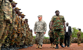 Maj. Gen. David R. Hogg (center), commander U.S. Army Africa and Lt. Col. A.B. Conteh, AMISOM Battalion Commander, RSLAF, inspect Sierra Leone troops during a deployment ceremony.
