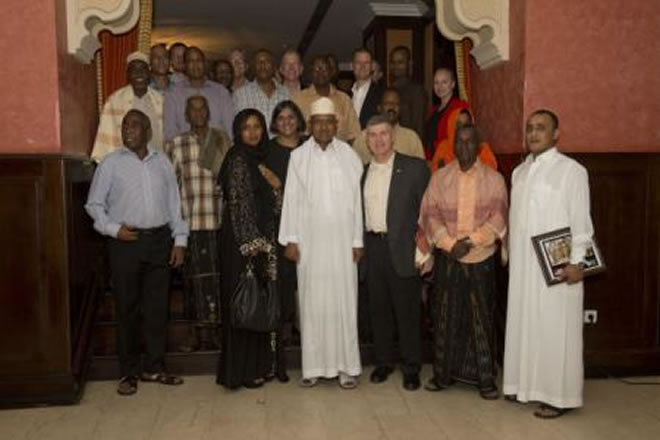 Attendees of an Iftar dinner pose for a group photo July 7, 2014, at the Kempinski Hotel, Djibouti. Leaders from CJTF-HOA, Camp Lemonnier, and the U.S. Embassy gathered with Djiboutian military leaders and their families for the celebration of the month-long Ramadan fasting. (U.S. Air Force photo by Staff Sgt. Leslie Keopka)