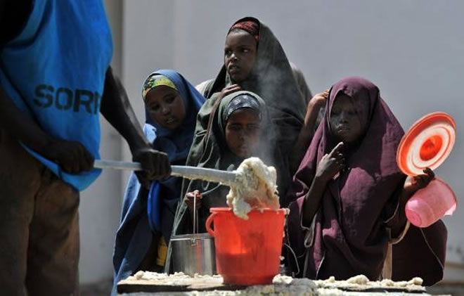Displaced Somali children queue on January 19, 2012 as they wait for food-aid rations at a distribution centre in the capital Mogadishu. Somalia's capital is once again facing an acute hunger crisis. Picture: AFP PHOTO/ TONY KARUMBA
