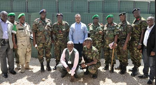 ![]() Group photo of Special Representative of the Chairperson of the African Union Commission for Somalia (SRCC) Ambassador Mahamat Saleh Annadif AMISOM Force Commander Lt. Gen. Silas Ntigurirwa, Sierra Leone Chief of Defence Forces, Brigadier General Samuel Omar Williams, and the officers who accompanied the CDF to a meeting at the SRCC’s office on 1st June 2014. Photo credit: AMISOM |