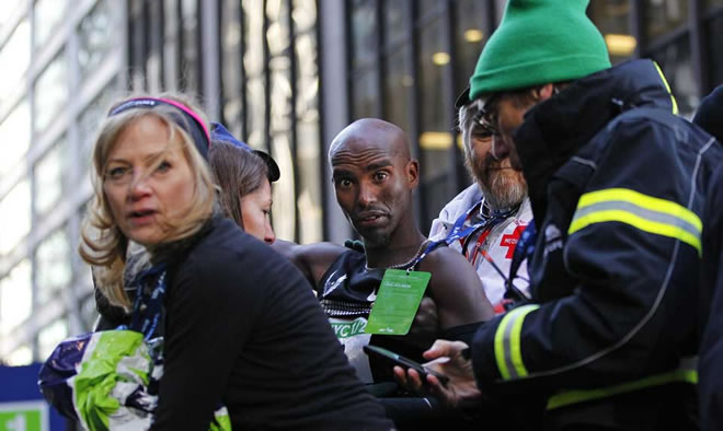 The Somali born star took a hard fall some five miles into the race. He made a gritty recovery to finish second behind Geoffrey Mutai, who won in 1hr 00min 50sec.