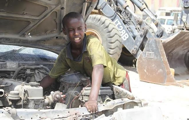 11-year-old Hassan Abdullahi Duale works 12-hour shifts at a car-repair shop in Somalia’s capital Mogadishu. Credit:Alinoor Salad/IPS