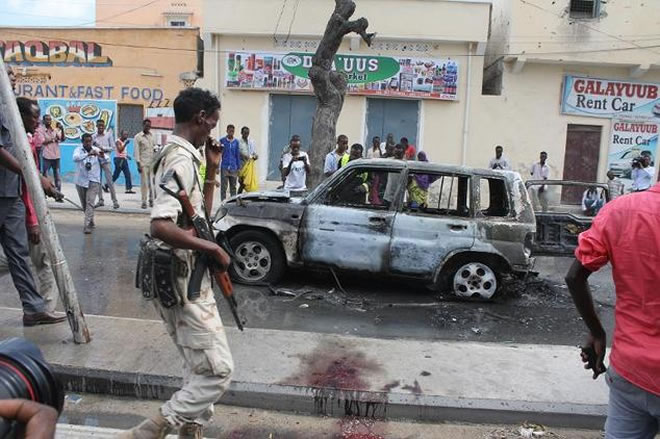Security forces and civilians gather around a car which exploded on the Maka Almukarama road in Mogadishu, one of the seaside capital's busiest and central roads, on November 16, 2014 ©Abdifitah Hashi Nor (AFP).