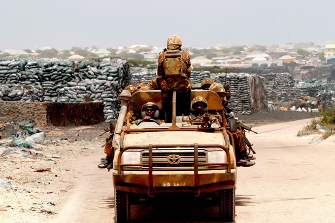 AMISOM soldiers patrol near stockpiles of charcoal close to the Kismayo sea port, February 27, 2013. (Feisal Omar / Courtesy Reuters)