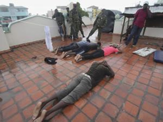 Kenyan police officers arrest Muslim youths at the Masjid Shuhada mosque in Mombasa.