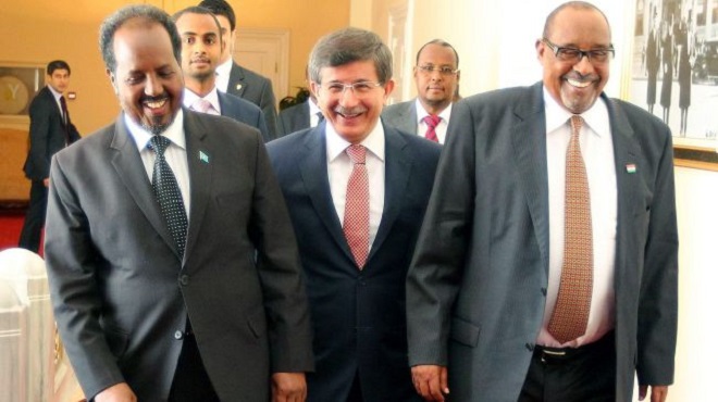Turkish Foreign Minister Ahmet Davutoğlu (C), Somali President Hassan Sheikh Mahmoud (L) and Somaliland President Ahmed Silanyo are seen at the Ankara Palas before holding a meeting on April 13, 2013. (Photo: AA, Cengiz Oğuz Gümrükçü)