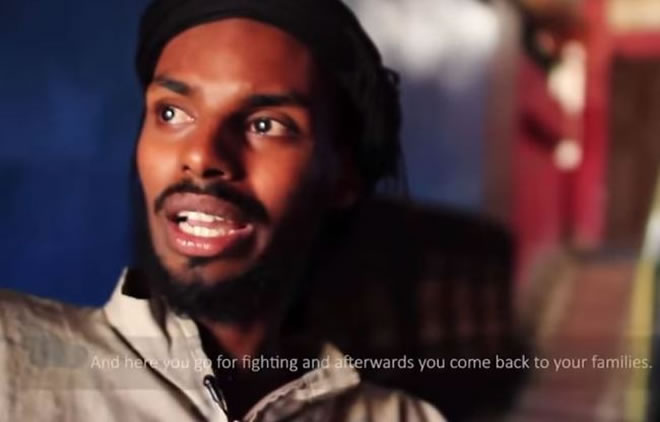 Hussein Faisal Ali, who goes by the alias Abu Shuaib al-Somali, appears in an ISIL video posted on YouTube. Ali, son of Somaliland's Justice and Welfare Party chairman Faisal Ali Warabe, left his home in Finland to join ISIL fighters. [Snapshot from YouTube video]