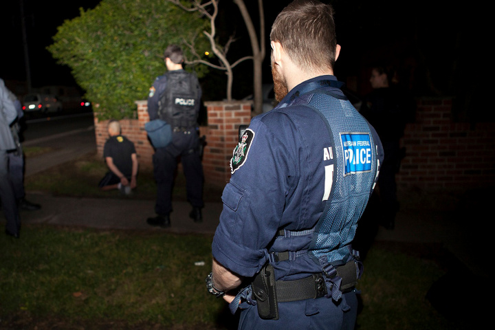 Australian Federal Police officers stand near a suspect detained after intelligence showed militants connected with ISIS were planning a beheading.