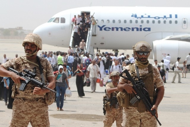 Security members stand guard as passengers disembark the first civilian aircraft to land in Yemen's second city in more than four months, on August 6, 2015.