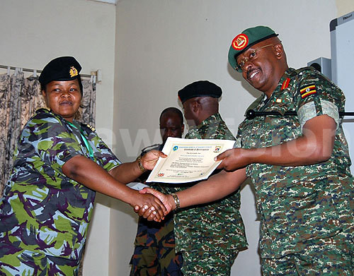 A Kenyan female navy soldier (left) receives her certificate from Brig. Gen. Leopold Kyanda during the pass out in Jinja.