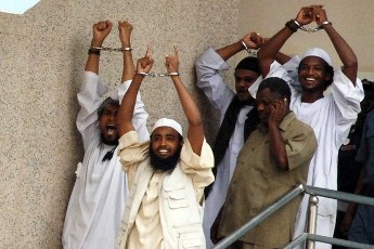 Four Sudanese convicts raise their handcuffs as they are escorted out of the courtroom in the capital Khartoum, 24 June 2009. (REUTERS/Mohamed Nureldin Abdallah)