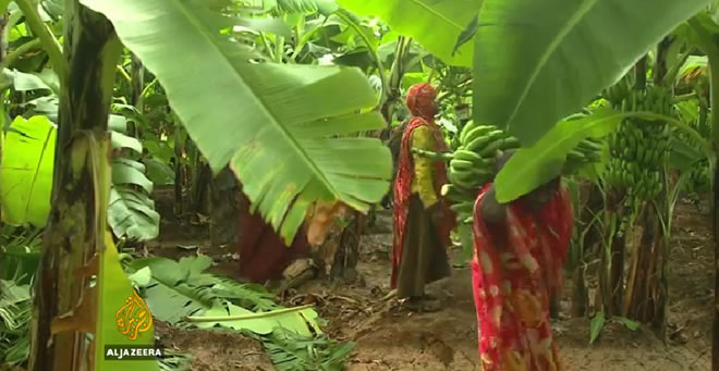 They are farmers attending to a large banana plantation in Somalia's farming capital of Afgoye, a riverside town some 30km south of the country's seaside capital Mogadishu.