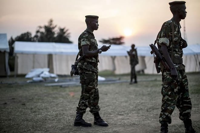 Burundian soldiers on patrol during the construction of several marquees in the Musaga neighbourhood of Bujumbura on June 28, 2015. AFP PHOTO | MARCO LONGARI
