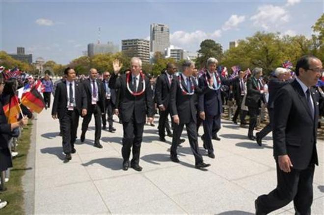 The otherwise somber occasion was lifted by the presence of about 800 Japanese schoolchildren waving flags of the G7 nations, including that of the United States, and cheering as the ministers walked past.