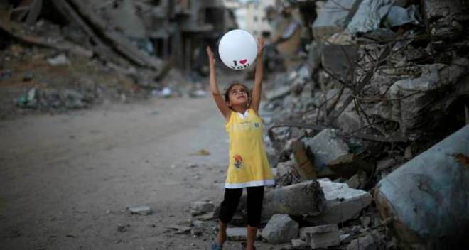A Palestinian girl plays in rubble in the east of Gaza City late in 2014 after an Israeli offensive. She, like many in Syria and the rest of Palestine, is still clinging to hope for a better future.
