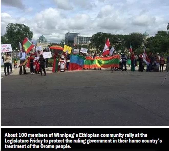 Approximately 100 members of Winnipeg's Ethiopian community rallied outside the Legislature Friday in trying to get Canadian political power to step in and stop human-rights violations in their homeland.