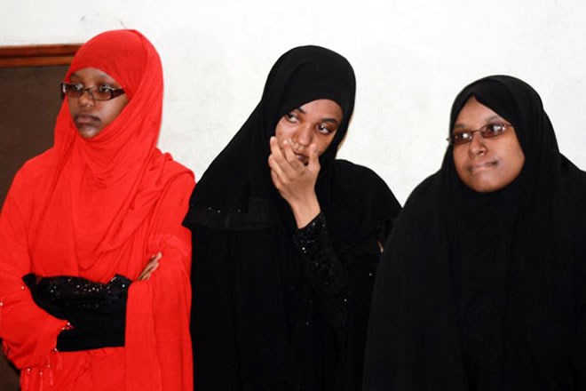 From left: Ms Ummukhayr Sadri Abdulla, Ms Maryam Said Aboud and Ms Khadija Abubakar Abdulkadir when they appeared in a Mombasa court on March 30, 2015. PHOTO | LABAN WALLOGA | NATION MEDIA GROUP