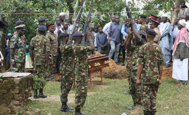 A Kenya Defence Forces soldier killed in El Adde, Somalia, was buried in Mumias East Monday.Speaking during the burial ceremony in Makunga, Saidi Olacho said his son Omar Olacho's desire to protect Kenyans saw him quit his studies at Kenya Medical Training College to join the military in 2012.