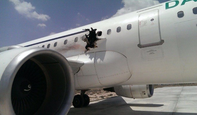 The blast forced the pilot of Flight 159, bound for Djibouti with 74 passengers on board, to make an emergency landing about 15 minutes after takeoff from Mogadishu.