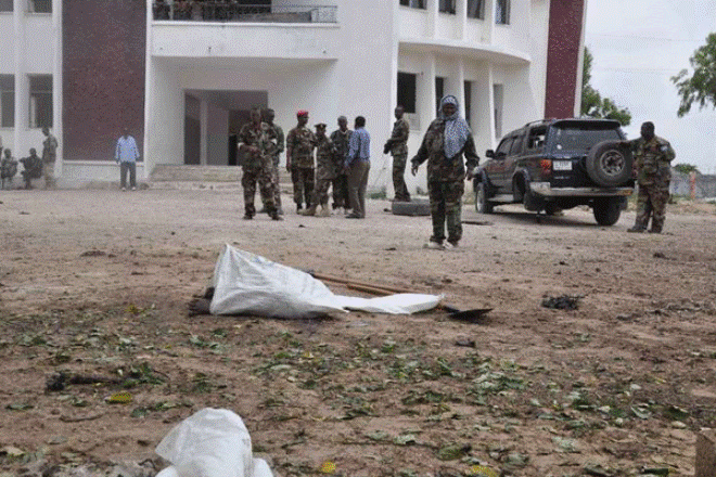 Somali government soldiers view remains of a suicide bomber who killed four of their colleagues and wounded 12 others after blowing himself up at the Somali army headquarters in Mogadishu. PHOTO | FAISAL ISSE | XINHUA