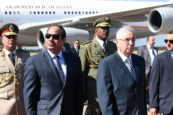 Egypt’s president Abdel Fattah al-Sisi (second left) is welcomed by Algerian Senate speaker Abdelkader Bensalah upon his arrival at Houari-Boumediene International Airport on June 25, 2014. Sisi and his supporters say tough measures are needed as authorities are fighting an insurgency in northern Sinai by militants who have pledged allegiance to the Islamic State group. PHOTO | AFP AFP